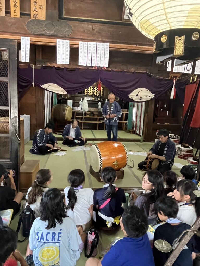 神社についてもっと知ってもらおうと、初めての試みとして六日町小学校3年生の子どもたちに総合的な学習の時間を活用し、神社の見学の機会を計画しました。責任役員による境内や本殿の説明を受けながら、神社は鎌倉時代に建てられ、長い歴史の中で六日町を見守ってきてくれていること、鳥居をくぐるときに帽子をとったり礼をすること、神社の入り口には狛犬(こまいぬ)が置かれ、神社を護(まも)っていること、手水舎(ちょうずや)でお参り前にきれいな水で身を清めること、お神輿(みこし)は神様をのせて町中を練り歩いていくことなど、子どもたちの新たな気付きは枚挙にいとまがありません。また、見学の最後には、お囃子(はやし)の皆さんから神様への豊作の祈願や感謝などを伝える太鼓や笛の演奏に、演奏者の身振り、手振りなどを真似をしながら聞いている多くの子どもたちの姿に一体感を感じました。神社の?をいっぱい見つけ、満足感と充実感にあふれた時間となりました。【文責 松﨑 】